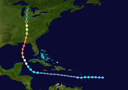 In mid-October, a tropical wave exited the African coast, but high wind shear and interaction with Hurricane Paulette limited development. The wave was monitored for possible tropical development for several days. The tropical wave remained rather disorganized. On October 24, the system had gained a very weak closed circulation was declared Tropical Depression Nineteen. The next day, Nineteen was upgraded to Tropical Storm Teddy. Teddy briefly peaked with 50 mph winds before increasing wind shear caused the storm to become even more disorganized. At 11:00 AM on October 26, Teddy dissipated into a remnant low pressure area. At this point, Teddy had a very slight, yet unlikely, chance of regeneration in a few days, as most forecasts called for wind shear in the eastern Caribbean to tear the storm apart. On October 29, wind shear decreased, and Tropical Storm Teddy had re-generated. Teddy's organization began to improve as the shear rapidly dissipated, and late on October 30, Teddy was upgraded to a category 1 hurricane. Explosive intensification took place on October 31, with Teddy skipping over category 2 status and becoming a category 3 major hurricane - becoming the eighth record-breaking major hurricane of the season. By the end of that day - Teddy was already a massive, powerful Category 5 hurricane with winds of 165 mph. Early on November 1, Teddy's winds reached 195 mph - an Atlantic record, while its pressure fell to 880 mbar - another Atlantic record. Teddy also became the first November Category 5 Atlantic hurricane since 1932. At this point, Teddy was located off the coast of Florida. Teddy's first two fatalities occurred in Tampa due to extremely high seas of 12 feet. Late on November 1, Teddy made landfall in Alabama as a Category 5 hurricane with winds of 175 mph, and took an unusual northerly path through western Georgia. Teddy began to weaken, and on November 3, became extratropical while located over central Kentucky and producing hurricane-force winds. Teddy's extratropical dissipated on November 5 in northern Michigan. For a storm of Teddy's magnitude, Teddy actually wasn't nearly as bad as many anticipated. Nevertheless, Teddy did still cause 74 fatalities and $15 billion in damage. Over 30 of the deaths were not in the United States.