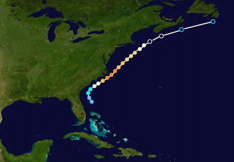 On October 17, an extratropical low pressure area that had brought heavy rains to North Carolina - as much as 5 inches in Raleigh on October 16 - exited the coast. The low pressure area slowly started to improve in organization. On October 18, the system had gained a rather disorganized closed circulation, but was declared Subtropical Depression Eighteen. Eighteen was initially expected to not strengthen into a tropical or subtropical storm due to colder water temperatures. However, a shift in the jet stream pushed Eighteen into a much more favorable environment, and on October 20, Eighteen was upgraded into Subtropical Storm Sally. Shortly afterward, Sally became fully tropical, and on October 23, Sally gained hurricane-force winds, and a small eye, becoming the 12th hurricane of the season. On October 26, Sally became extratropical with 70 mph winds while located in the open Northern Atlantic ocean. Sally did not cause any damage or deaths.