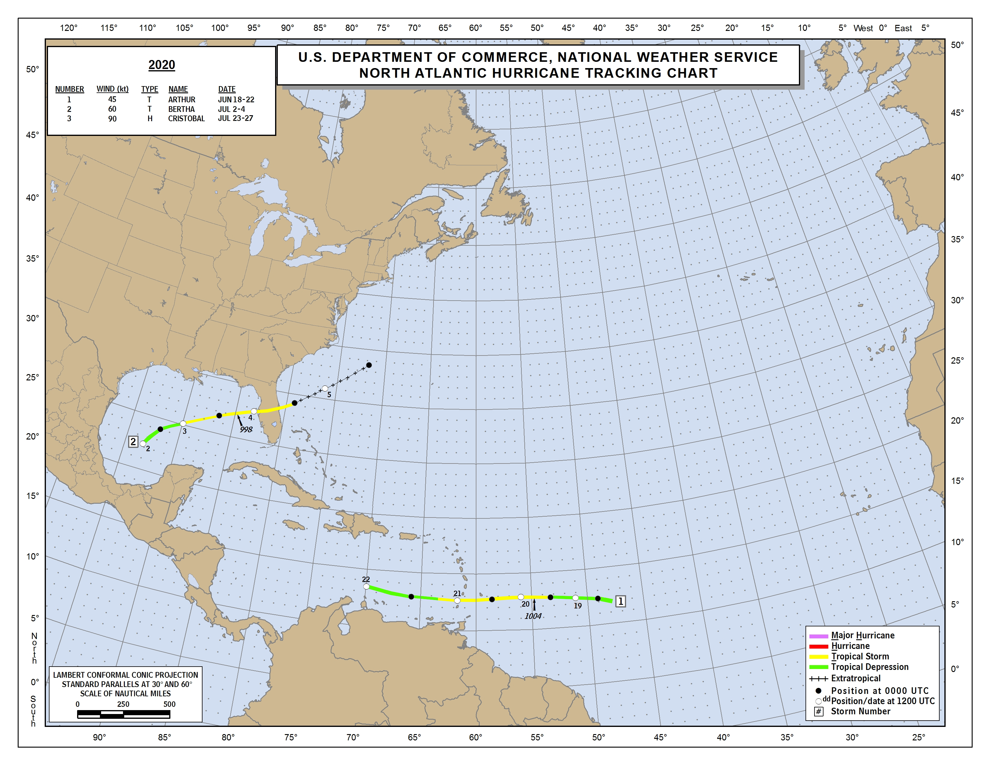 In advance of, and during, each hurricane season, several forecasts of hurricane activity are issued by national meteorological services, scientific agencies, and noted hurricane experts. These include forecasters from the United States NOAA's National Hurricane and Climate Prediction Center's, Philip J. Klotzbach, William M. Gray and their associates at CSU, Tropical Storm Risk, and the United Kingdom's Met Office. The forecasts include weekly and monthly changes in significant factors that help determine the number of tropical storms, hurricanes, and major hurricanes within a particular year. As stated by NOAA and CSU, an average Atlantic hurricane season between 1981–2010 contains roughly 12 tropical storms, 6 hurricanes, 3 major hurricanes, and an Accumulated Cyclone Energy (ACE) Index of 66–103 units. NOAA typically categorizes a season as either above-average, average, of below-average based on the cumulative ACE Index; however, the number of tropical storms, hurricanes, and major hurricanes within a hurricane season is considered occasionally as well. Pre-season forecasts[]On December 7, 2019, Tropical Storm Risk (TSR), a public consortium consisting of experts on insurance, risk management, and seasonal climate forecasting at University College London, issued an extended-range forecast predicting an average hurricane season. In its report, TSR noted that tropical cyclone activity could be about 2% above the 1950–2010 average, with 12.2 (±4.4) tropical storms, 6.4 (±3.7) hurricanes, and 1.3 (±0.8) major hurricanes anticipated, and a cumulative ACE index of 102 (±64). Later that month on December 21, Weather Services International (WSI) issued an extended-range forecast predicting a near average hurricane season. In its forecast, WSI noted that an unprecedented return of the Pacific Decadal Oscillation beginning in 2018, combined with a forecast strengthening El Niño, would result in a near-average season with 13 named storms, 7 hurricanes, and 3 major hurricanes. They also predicted an above-average probability of a hurricane landfall, with a heavily elevated chance on the Greater Antilles and a slightly reduced chance along the East Coast of the United States, citing a stronger Bermuda High. On April 4, 2020, Colorado State University (CSU) issued their updated forecast for the season, calling for a below-normal season due to an increased chance for the development of an El Niño during the season. In April 2012, TSR issued their update forecast for the season, slightly raising their forecast due to a large model spread for El Niño projections. On May 24, 2020, the NOAA released their forecast for the season, which echoed the sentiment of prior forecasts. The agency predicted a near-normal season, with eleven to fourteen named storms, four to six hurricanes, and one to two major hurricanes. The NOAA based its forecast on higher wind shear and cooler sea surface temperatures in the Main Development Region of the Eastern Atlantic. Gerry Bell, lead seasonal forecaster at NOAA's Climate Prediction Center, added the main uncertainty in the outlook was how much below or above average the 2020 season would be, and if the neutral El Niño/Southern Oscillation would strengthen or weaken to a La Niña. That same day, the United Kingdom Met Office (UKMO) issued a forecast of a slightly above average season. They predicted 14 named storms with a 70% chance that the number would be between 7 and 16. However, they do not issue forecasts on the number of hurricanes and major hurricanes. They also predicted an ACE index of 112 with a 70% chance that the index would be in the range 35 to 167. On May 30, 2012, the Florida State University for Ocean-Atmospheric Prediction Studies (FSU COAPS) issued its annual Atlantic hurricane season forecast. The organization predicted 15 named storms, including 8 hurricanes, and an ACE index of 124. Mid-season forecasts[] Official NHC track map of the season On June 1, Klotzbach's team issued their updated forecast for the 2020 season, predicting fifteen named storms and seven hurricanes, of which four of the seven would further intensify into major hurricanes. The university stated that there was an unexpected warming of Atlantic sea surface temperatures, and a high amount of uncertainty concerning whether the neutral ENSO conditions would continue to decrease or further develop in time to hinder tropical development in the Atlantic. They also stated there was a generally average chance of a major hurricane impacting the United States coastline in 2020. On June 6, Tropical Storm Risk released their second updated forecast for the season, predicting seventeen named storms, eight hurricanes, and five major hurricanes. In addition, the agency called for an Accumulated Cyclone Energy index of 135. Above average sea surface temperatures and lesser wind shear was cited for increased activity compared to previous seasons. Tropical Storm Risk continued with their forecast of a near-average probability of a United States impact during the season using the 1950–2011 long-term normal, and a near-average chance of a United States landfall by the recent 2002–2011 normal. On August 9, 2020, the NOAA issued their mid-season outlook for the remainder of the 2020 season, drastically upping their final numbers. The agency predicted between thirteen and eighteen named storms, six to twelve hurricanes, and three to four major hurricanes. Gerry Bell cited warmer-than-normal sea surface temperatures and lesser than average wind shear. Season summary[]![]() Storms[]Tropical Storm Arthur[]