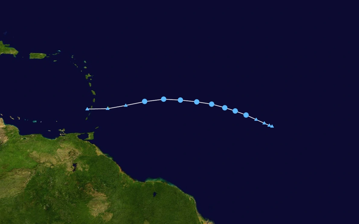 During mid August, a large tropical wave moved off the coast of Africa and had been marked for development within the next few days. The wave's appearance didn't get better though, as the wave had encountered dry air as it gradually moved west. After moving out of the dry air environment, the wave finally started to get its act together, and as a result, its appearance improved along with a developing circulation. Moving slightly northwest, the wave was expected to come close to the Windward Islands and possibly become a hurricane off the East Coast. The wave, now an invest, had finally developed a fully closed circulation, forcing the NHC to upgrade the storm to a tropical depression at 18:00 UTC on August 22, the third of the season so far. Instead of what was forecasted for the depression's track, the storm turned more west again, threatening the Caribbean Islands once again. However, the depression started to struggle, as dry air started to infiltrate the storm. The depression continued west and early on August 24, the depression peaked with a minimum pressure of 1007 mbar. The storm's pressure had started to rise after that, and by 18:00 UTC that same day, the depression had degenerated into a remnant low. The remnants continued west and eventually made landfall on the island of Barbados early on August 25. The low then entered the Caribbean Sea before finally dissipating.