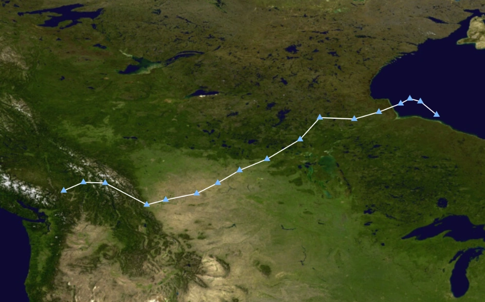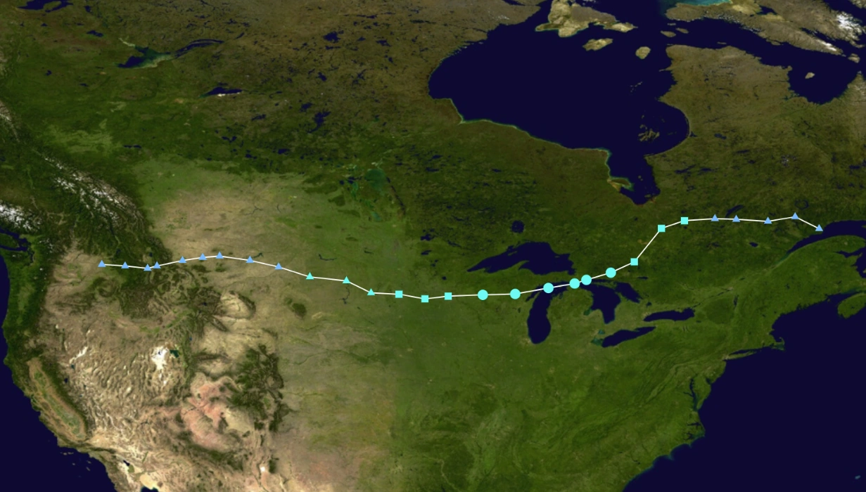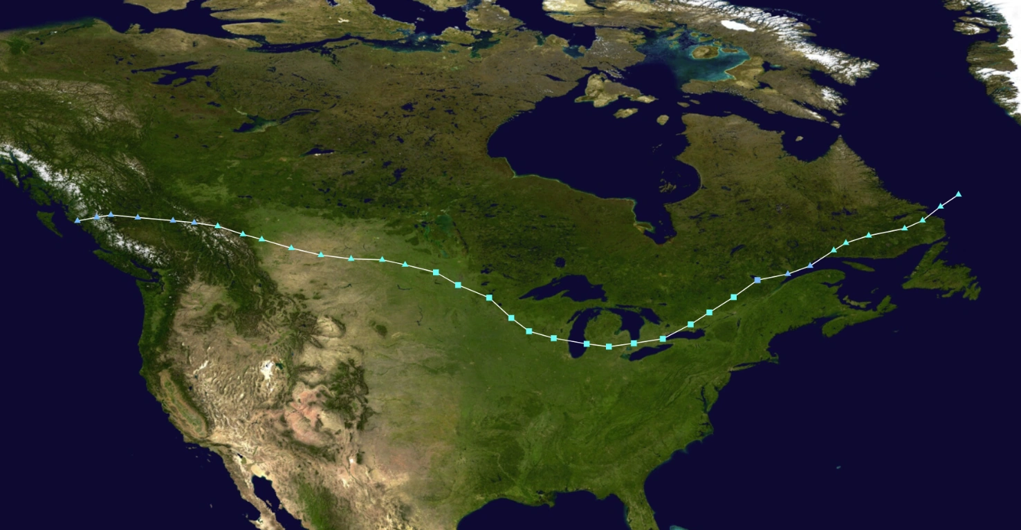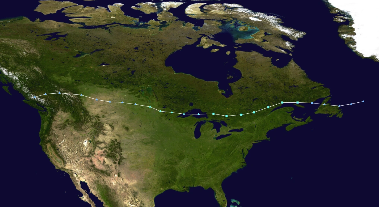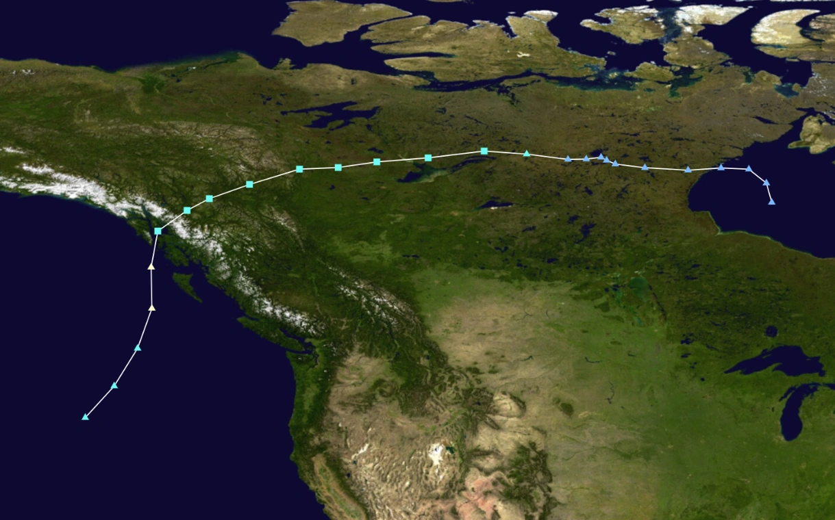 On November 5, a bomb cyclone located in the northern Pacific Ocean near the coast of Canada forced a broad region of low pressure onshore. Upon crossing the Rockies, it organized and began moving east southeast along the US-Canada border. An additional pocket of low pressure associated with the same system developed over the western United States, and would contribute to the strengthening of the storm on November 6. A largely zonal jet stream contributed to the presence of moderate Arctic air over Canada, allowing for some snowfall to occur over parts of Alberta and Saskatchewan. That evening, the WPC classified the storm as a potential winter weather event as the low strengthened to 1001 mbar (29.55 inHg). The storm began to intensify at an increasing pace on November 7, strengthening to 994 mbar (29.35 inHg) by 13:00 UTC over Lake Superior. Later that night, a widespread area of accumulating snowfall allowed the system to be upgraded to a winter weather event and triggered the issuance of snowfall warnings in far eastern Ontario. Three peaked at 990 mbar (29.23 inHg) with wind gusts of 45 mph (70 km/h) before moving over western Quebec. Totals of up to 8 inches (20 cm) of snow were seen in Ontario, with the highest totals from the storm occurring east of Lake Superior, where snowfall rates were increased due to lake enhancement. The system weakened slowly upon moving east along the St. Lawrence River. On November 9, Three dissipated after it entered the Atlantic Ocean.