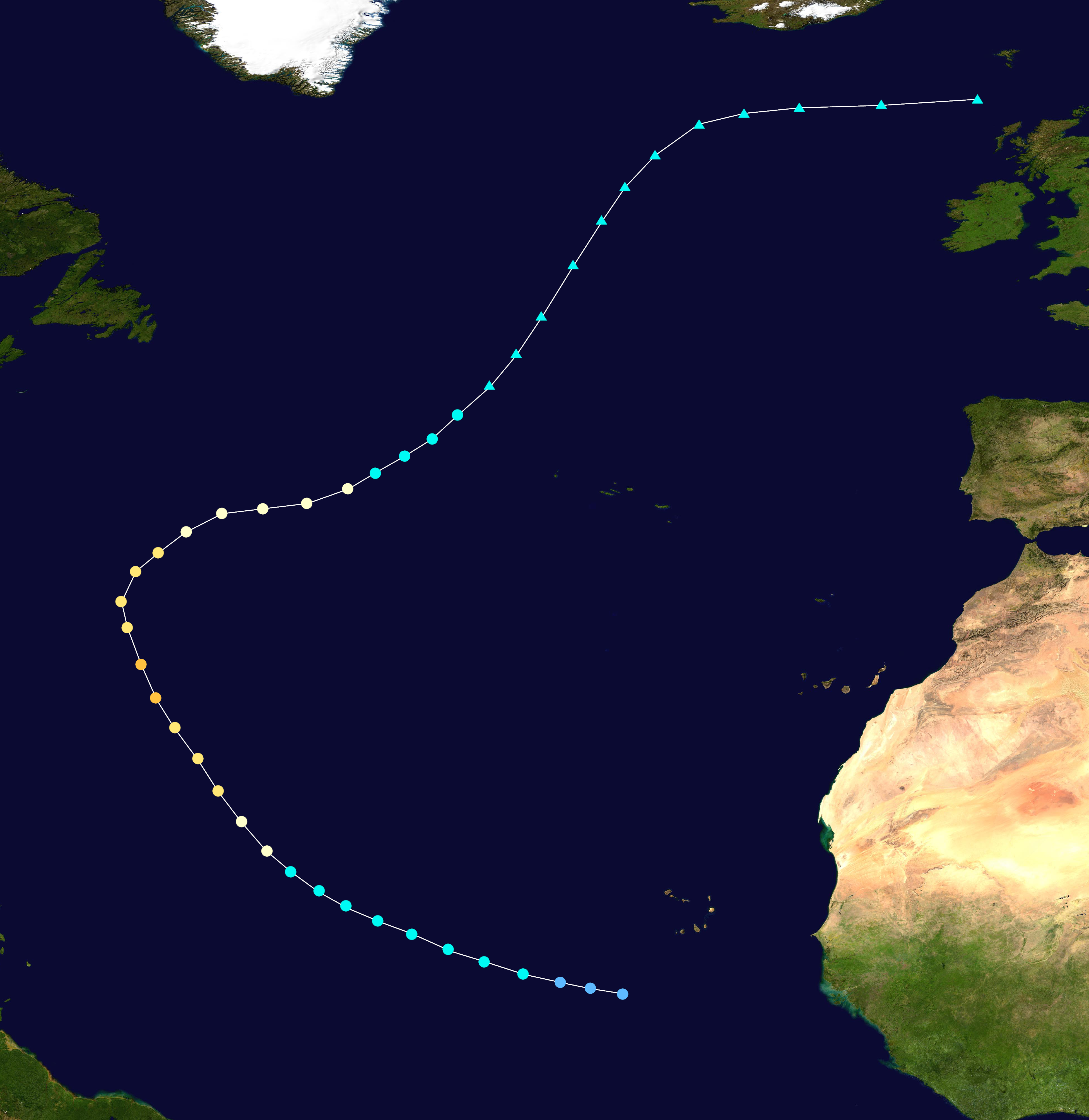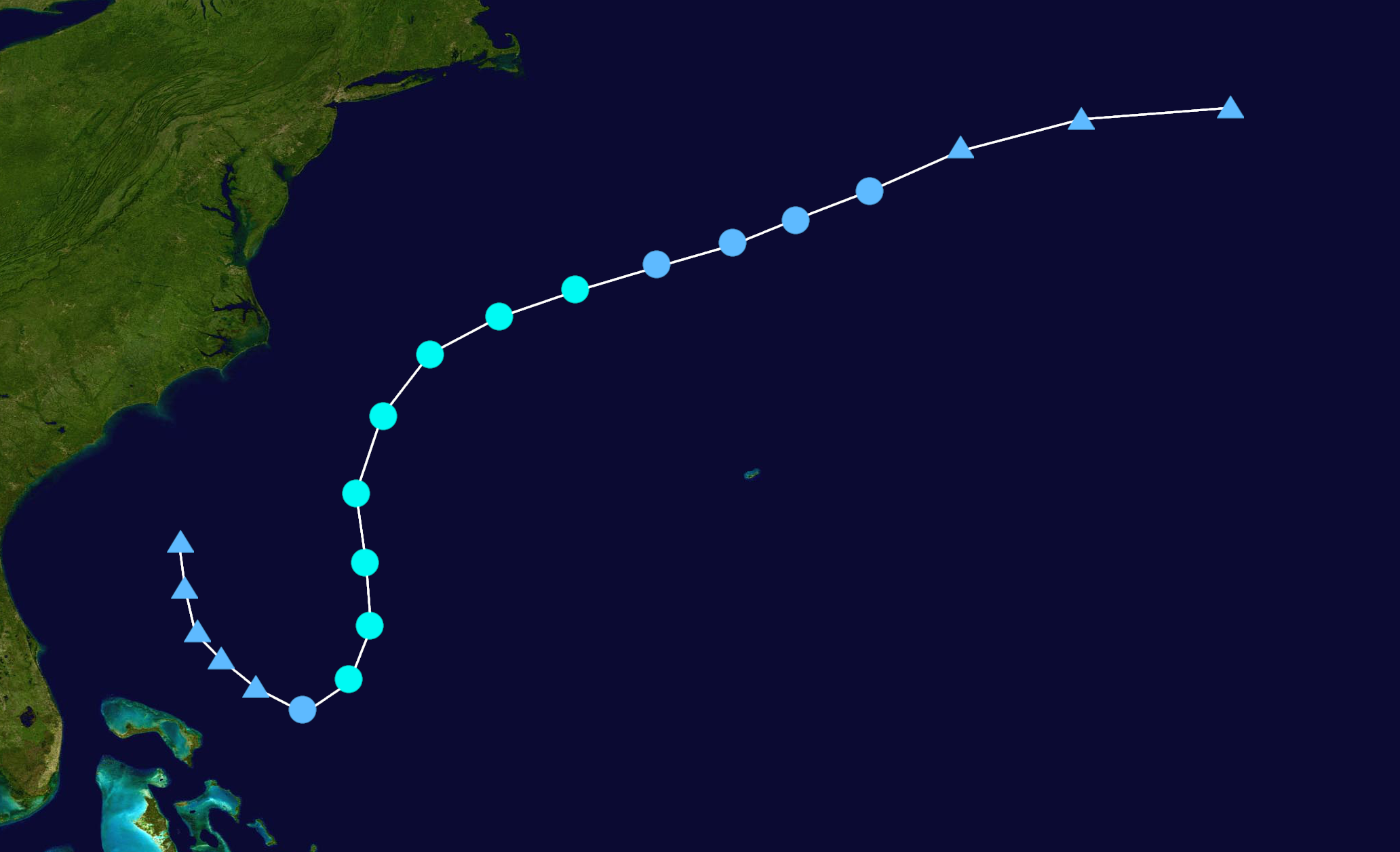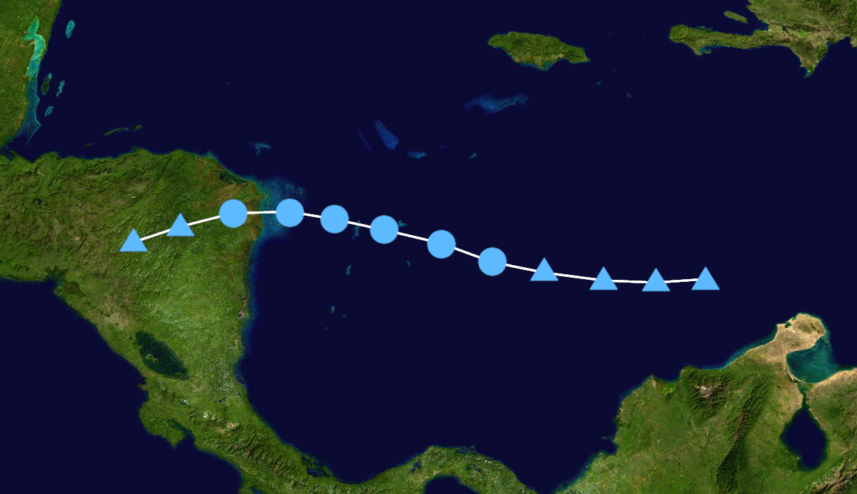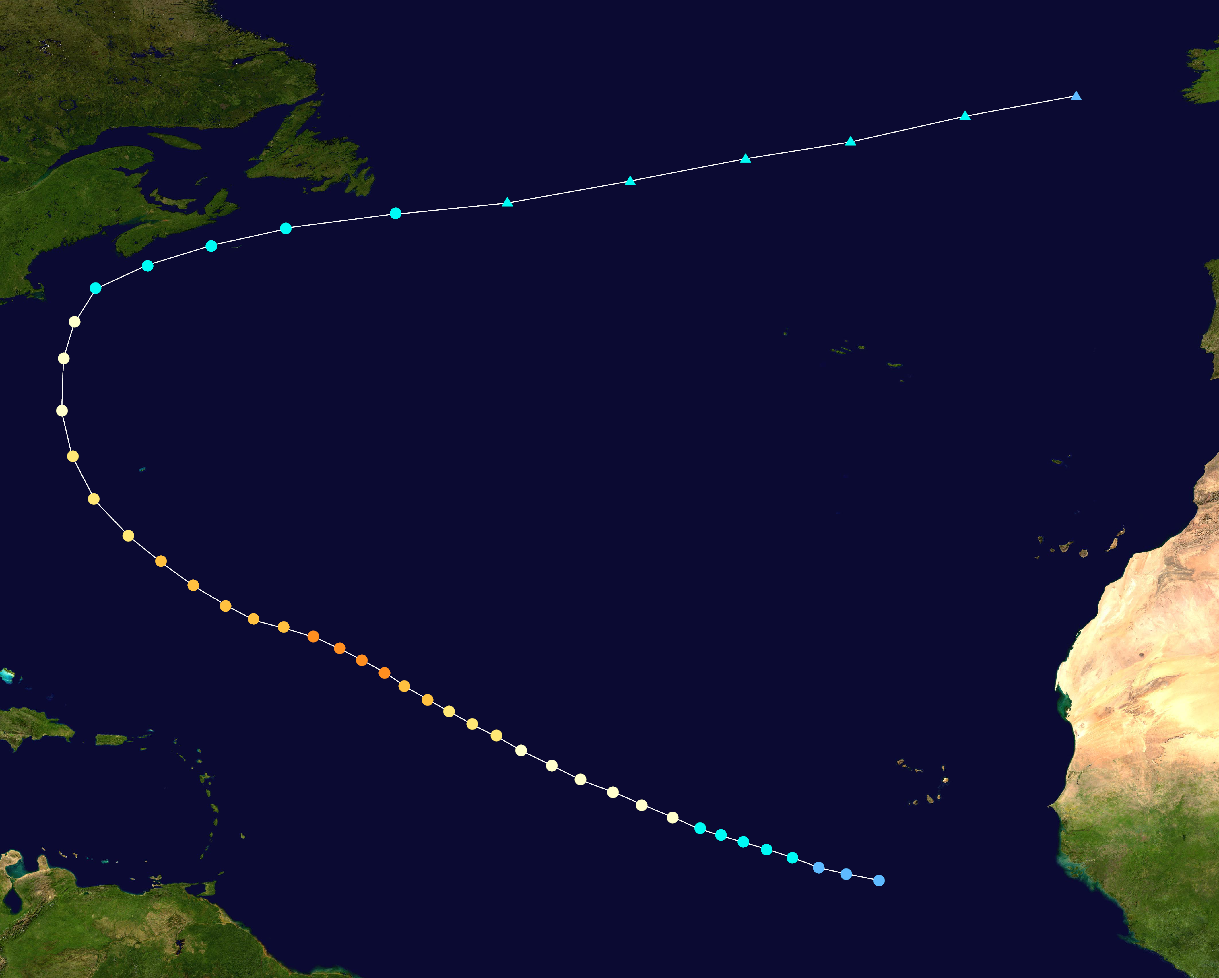 An organized tropical wave moved into the eastern Atlantic on October 1, gradually developing shower and thunderstorm activity as it tracked westward. The wave developed into a tropical depression early on October 3, intensifying into Tropical Storm Melissa the next day. Unfavorable conditions prevailed as it moved westward, hindering initial strengthening as the storm's center remained displaced near the northeastern edge of its convection. Late on October 5, Melissa's cloud tops began cooling, and the cyclone organized significantly, allowing Melissa to intensify into a hurricane the next day. Approaching the Lesser Antilles, Melissa continued intensifying and reached Category 3 intensity on October 7 at 12:00 UTC. However, immediately afterwards, the system encountered a high-pressure system over the Leeward Islands and began an eyewall replacement cycle, weakening into a Category 2 hurricane the next day as it curved to the north. The storm's convection became slightly disorganized over the next day, but soon entered warmer waters, re-intensified into a Category 3 hurricane on October 9 at 12:00 UTC, and turned to the west-northwest. As the cyclone's center became much more organized and its convection increased, it intensified into a Category 4 hurricane and soon peaked as a Category 5 hurricane on October 10 with winds of 165 mph (270 km/h). The storm soon weakened into a Category 4 hurricane on October 11 and began approaching North Carolina. At 19:30 UTC (3:30 pm EDT) on October 12, Melissa made landfall south of Southport, North Carolina, with sustained winds of 130 mph (210 km/h) and a central pressure of 931 mbar (27.5 inHg). The storm moved inland and began rapidly weakening, falling below hurricane intensity just twelve hours later. The storm continued north over the eastern United States before transitioning into an extratropical cyclone over New York on October 14. Its remnants persisted for roughly two days before dissipating in the Labrador Sea late on October 15.