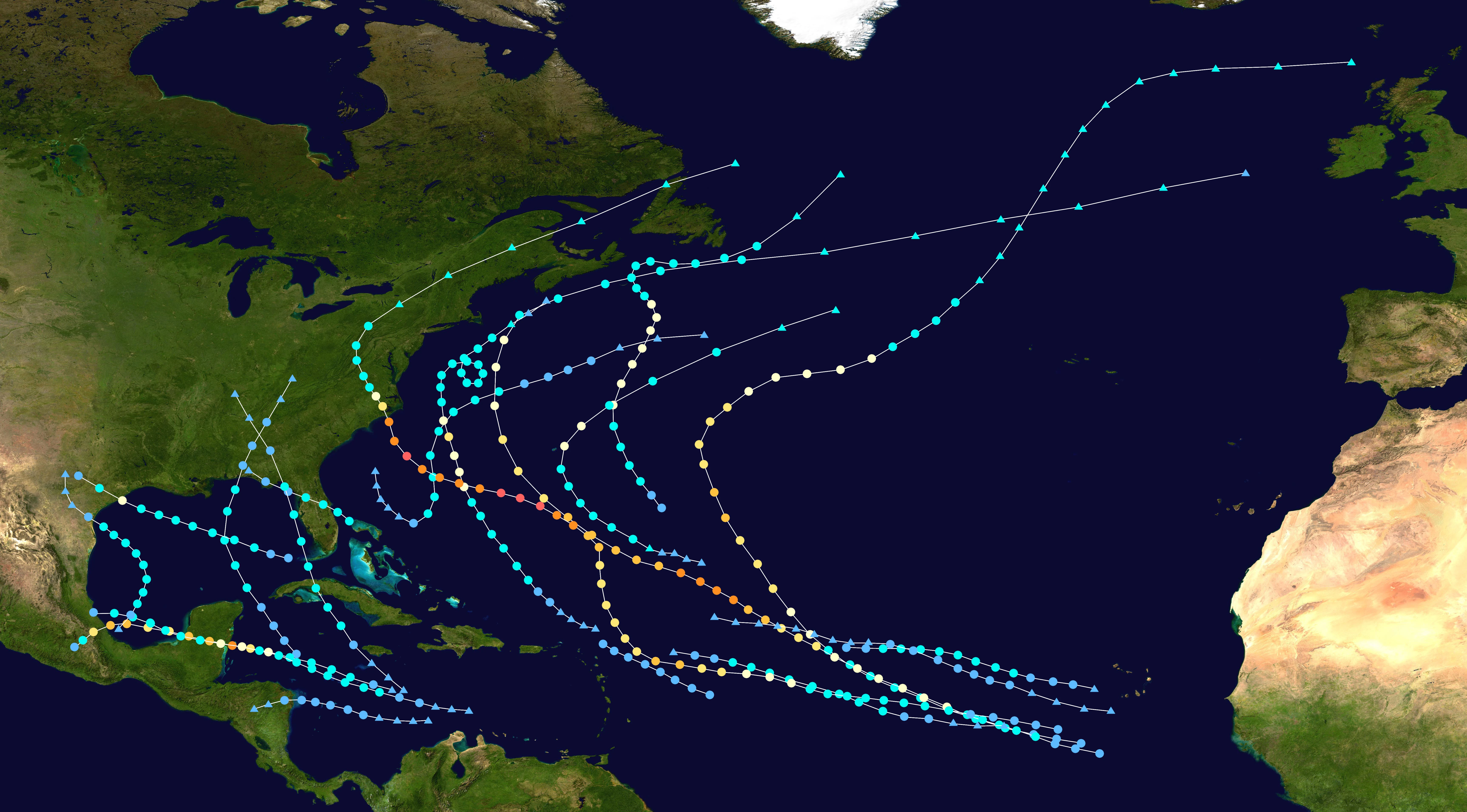 The 2025 Atlantic hurricane season was the final year in a consecutive series of ten active and destructive Atlantic hurricane seasons since 2016. The season was very active, producing nineteen tropical cyclones, sixteen named storms, nine hurricanes, and four major hurricanes. It officially began on June 1, 2025, and ended on November 30, 2025, dates that historically describe the period in each year when most tropical cyclones form in the Atlantic basin and are adopted by convention. The first tropical storm of the season, Andrea, developed on June 3, while the final system, Tropical Storm Pablo, dissipated over the United States on November 14.