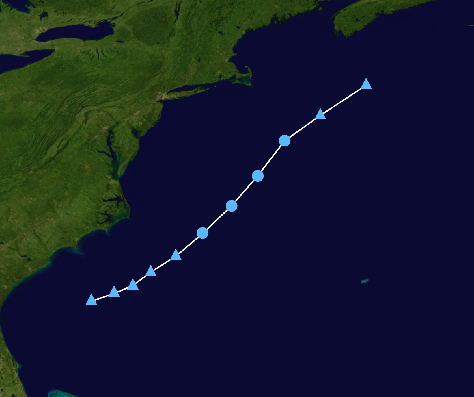 The National Hurricane Center began to anticipate the formation of a low pressure trough north of eastern Cuba on May 21, which was when the precursor to Tropical Storm Daisy was first marked on their Tropical Weather Outlook. On the 24th, the trough formed near the southeastern Bahamas and moved sluggishly in a northwestern direction. While warm sea surface temperatures were present in its direction and general vicinity, there was moderate wind shear that caused the trough to struggle with obtaining tropical characteristics. It produced mostly shallow convection despite the warm waters, and said convection was displaced from the center; this lack of deep, organized convection resulted in the National Hurricane Center being hesitant to declare it a tropical cyclone despite it possessing all other features characteristic of one. Towards the end of the day on May 25, the strong wind shear began to abate somewhat, and the low produced much colder cloud tops and deeper convective bursts than before. It sustained these bursts and maintained them near the center, unlike previous ones, and this resulted in the storm's designation as a tropical depression at 03:00 UTC on May 26. Newly-formed Tropical Depression Four, located east of Central Florida, moved in a north-northwestward direction but started to turn to the east. It remained mostly stagnant intensity-wise for the next day before the wind shear that plagued its core and satellite appearance backed away further, allowing for it to attain tropical storm status and receive the name Daisy at 9:00 UTC on the 27th. This made it the earliest 4th named storm in the Atlantic basin by almost a month. While moving east-northeast, Tropical Storm Daisy quickly strengthened and eventually attained its peak intensity of 50 mph (80 km/h) and minimum barometric pressure of 1000 mbar (29.53 inHg). As it accelerated northeast, Daisy entered cooler waters, and wind shear began to increase again; this quickly initiated a weakening trend marked by an increasingly degraded satellite appearance in the storm. At 03:00 UTC on May 29, Daisy’s winds decreased to those of a tropical depression, and it became a post-tropical cyclone just 6 hours afterwards. While continuing to race to the northeast, the remnants of the storm eventually attached to a frontal feature and were absorbed by it.