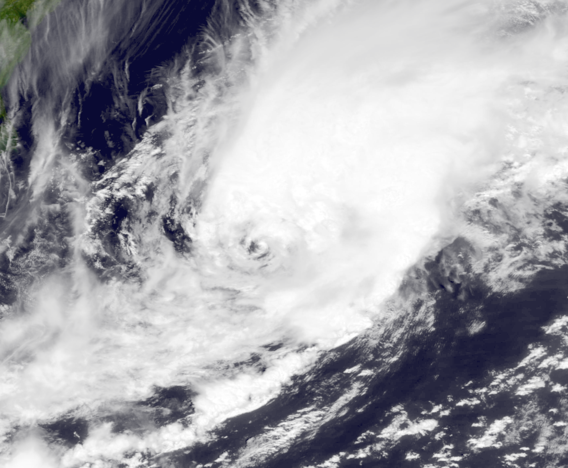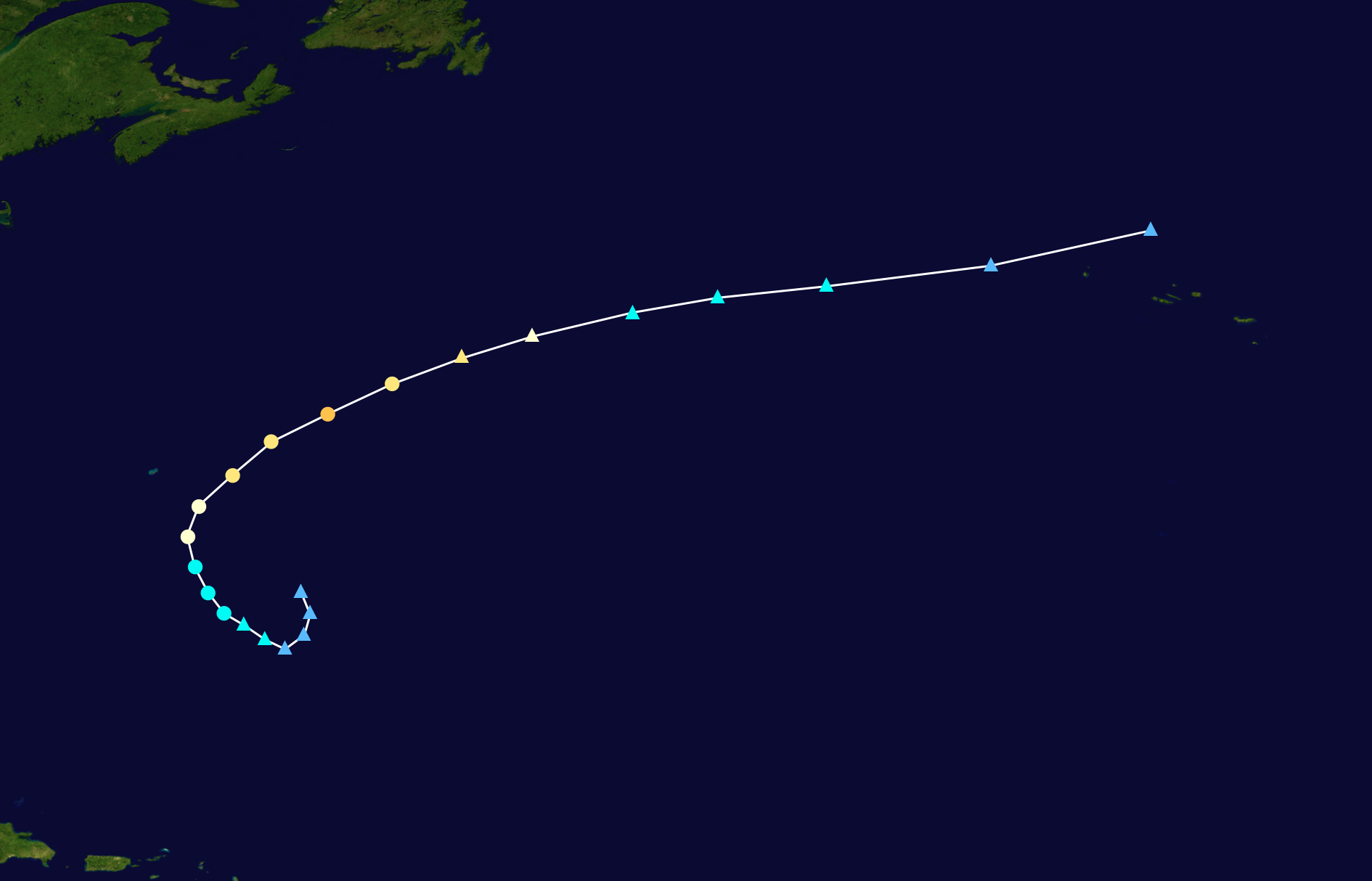 Cristobal's origins can be traced to a non-tropical low located several hundred miles southwest of Bermuda. The low encountered somewhat favorable conditions for (sub)tropical development and executed a cyclonic loop while strengthening, eventually attaining gale-force winds. Soon afterwards, its satellite presentation began to resemble that of a subtropical cyclone, and at 09:00 UTC on May 19, the system was designated Subtropical Storm Cristobal due to a well-defined warm core but somewhat displaced deep convection. Over the next 30 hours, Cristobal gradually underwent a tropical transition in response to its increasingly conducive environment. At 15:00 UTC the following day, it was re-classified as a fully tropical storm with winds of 50 mph (80 km/h). For the next day and a half, it steadily intensified due to anomalously warm sea surface temperatures. Cristobal ultimately became a rare May hurricane on the 22nd, peaking with a wind speed of 80 mph (129 km/h). However, as it accelerated northeastward, it began to traverse through cooler waters, and it initiated an extratropical transition while quickly weakening. By May 23, Cristobal had completed its transition into an extratropical cyclone and raced northeast for another 18 hours before being absorbed into another extratropical system.