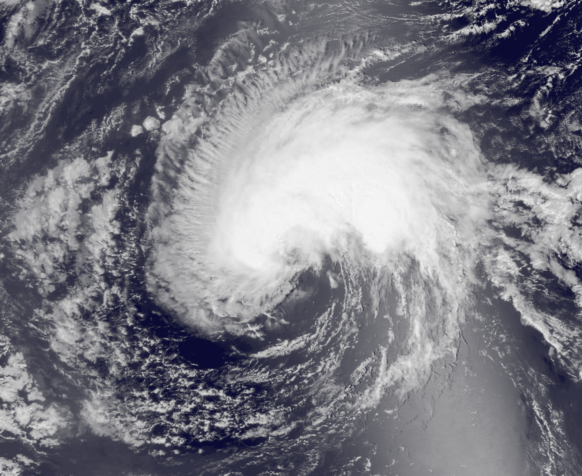 The precursor to what would be the final storm of the season was first noted by the NHC on November 29. Two days later, a low formed and slowly began to resemble a subtropical cyclone. Because the official hurricane season ends on November 30th, Special Tropical Weather Outlooks were issued thereafter to track the system. It intensified and reached gale force early on December 3. Convection continued to increase near the center, and advisories were initiated on Subtropical Storm Beta at 21:00 UTC that day. Beta moved northwestward into an unusually favorable environment, enabling it to become a fully tropical cyclone on the 4th. Its track turned northeastward, and the continuation of above-average water temperatures and low wind shear caused it to intensify further. At 03:00 UTC on December 6, it became an uncommon December hurricane, and an eye was apparent on satellite imagery. Despite characteristically unfavorable environments for tropical development in December, the water temperatures remained anomalously high in Beta's path, enabling it to strengthen even further. At 21:00 UTC on the 7th, the hurricane attained category 2 status for the first time in December history. At this point in time, the NHC forecast the storm to become a category 3 major hurricane because ocean heat content (OHC) was anticipated to stay very high for the next day. Beta eventually attained an unprecedented peak intensity of 110 mph (177 km/h), with a corresponding pressure of 968 mbar (28.59 inHg); however, even though forecasts had still expected it to intensify further, it started to show signs of weakening, possibly due to unanticipated wind shear that disrupted its core. Eventually, Beta's eye cooled and became cloud-filled while it underwent a cyclonic loop. Furthermore, it fell to category 1 strength at 03:00 UTC on December 9, and much of the intense convection around the cooling eye waned some. 12 hours later, it began to transition into an extratropical cyclone, and soon it weakened to a tropical storm. At 15:00 UTC on December 10th, Beta became fully extratropical and headed northeast.