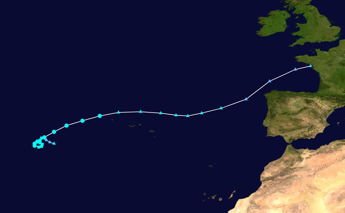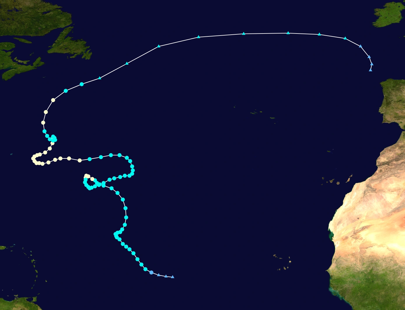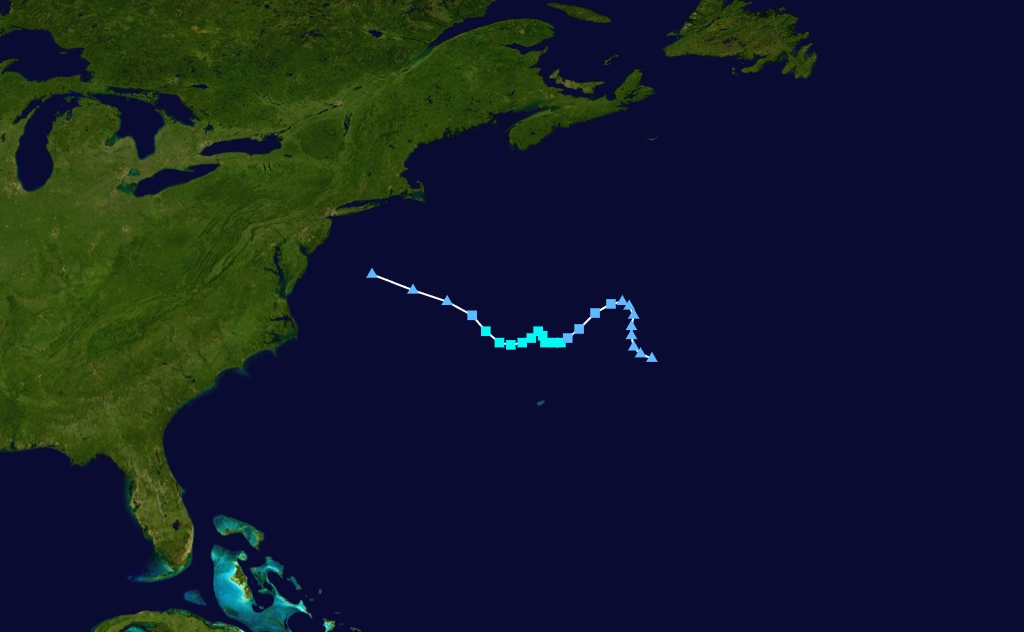 On September 20, a tropical wave exited the west coast of Africa. The wave tracked westward with little to no development during the next 3 days. On September 24, organization began to improve, and the following day, it was upgraded into a tropical depression over the central tropical Atlantic. The depression quickly intensified into Tropical Storm Melissa just six hours later and began a northwestward motion through a break in the subtropical ridge. Melissa faced light to moderate wind shear during the following few days, which restricted quick intensification. Still, Melissa ultimately reached its operational peak intensity as a high-end tropical storm with winds of 70 mph and a barometric pressure of 990 millibars on September 27. After reaching this intensity, Melissa decelerated as it approached a trough of low pressure located northeast of the Lesser Antilles. This trough induced moderate wind shear over Melissa, resulting in weakening and a sharp turn to the east-northeast. As Melissa rotated around the trough, it curved northward and weakened into a moderate tropical storm over the central Atlantic. As Melissa continued to rotate around the trough, it turned northwestward once again; meanwhile, wind shear relaxed, allowing Melissa to begin another round of intensification on September 29. Melissa continued to intensify while moving slowly northwestward, and it attained hurricane status on October 1 after forming an eye. The hurricane reached its second peak intensity with winds of 80 mph and a barometric pressure of 983 millibars on October 1, before abruptly turning southward as it encountered a high-pressure system to its west. Dry air entrainment induced weakening once again as Melissa moved southward, and it fell below hurricane intensity on October 2. Melissa continued to weaken as it turned eastward and east northeastward on October 3 as the high-pressure system began moving northeast. On October 5, Melissa encountered another high-pressure system to its east and turned sharply northward between the two high-pressure systems. The system to Melissa's northeast continued northward, allowing Melissa to turn back toward the west on October 6. This also induced more favorable upper-level wind patterns over the storm, allowing Melissa to resume intensification on the 6th. Sea-surface temperatures along Melissa's path remained around 26-27 °C, which were substantial enough to allow the storm to reach hurricane status once again on October 8. Melissa attained its third peak intensity with winds of 80 mph and a barometric pressure of 981 millibars on October 8. The hurricane then turned northward and eventually northeastward, making its closest approach to Bermuda on October 9. As Melissa moved further north, sea-surface temperatures declined and wind shear increased once again, resulting in weakening below hurricane intensity once again on October 12. Melissa then briefly turned southward once again on October 13 as it approached a system to its north, though turned back toward the north later that day as the other system moved away. Melissa began to accelerate as mid-latitude flow finally picked the small system up; baroclinic forcing allowed Melissa to reach hurricane status once again on October 14, and the hurricane attained its lowest barometric pressure during its duration as a tropical system, with winds speeds of 75 mph and a barometric pressure of 980 millibars. Continued declining sea-surface temperatures resulted in weakening once again on October 15 as Melissa began extratropical transition, and it finally transitioned into an extratropical cyclone on October 15 while located several hundred miles south of Newfoundland. The extratropical remnant continued eastward across the north Atlantic, passing south of Ireland on October 17 and turning southward before dissipating the following day, just a few hundred miles northwest of the Iberian Peninsula.