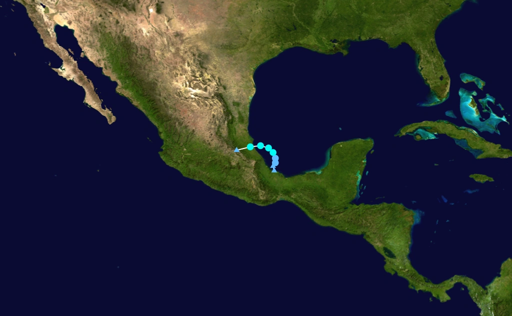 On August 31, a tropical disturbance spawned an area of low pressure in the eastern Pacific basin, located over the Gulf of Tehuantepec. The low moved northward, crossing Mexico on September 1 and 2. Later on September 2, it emerged over the Bay of Campeche and began to quickly organize. On September 4, the low was upgraded into a tropical depression. The depression continued northward and intensified into a tropical storm, receiving the name Gabrielle early on September 5. Gabrielle curved westward and continued to intensify, attaining a peak intensity with winds of 45 mph and a barometric pressure of 999 millibars late on September 5, just before moving inland over Veracruz, Mexico. Gabrielle rapidly weakened after moving inland and degenerated into a remnant low just a few hours later.