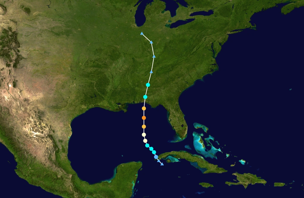 On August 12, a trough of low pressure formed over the western Caribbean Sea, just offshore of Honduras. The low moved erratically east northeastward over the next day or so and began to show signs of organization early on August 15. The low approached the western tip of Cuba late on the 15th and was upgraded into a tropical depression the following morning. The depression passed over the tip of Cuba and entered the Gulf of Mexico just a few hours later while intensifying, and it was upgraded into a tropical storm and named Dimitri just six hours after formation. Dimitri very quickly intensified through the 16th as it passed over sea surface temperatures exceeding 29 °C in association with the Gulf Stream, and it attained hurricane status just eighteen hours later. Dimitri then turned due northward on August 17 and began to rapidly intensify amid very favorable conditions. Flight reconnaissance into the eye of the hurricane found Dimitri to be a major hurricane at 12:00 (UTC) on August 17, with pressures dropping by nearly 3 millibars an hour. Continued rapid intensification occurred, and Dimitri attained category 4 status six hours after being upgraded into a major hurricane. It subsequently attained its peak intensity with winds of 130 mph and a barometric pressure of 948 millibars late on August 17. An eyewall replacement cycle commenced not much longer after Dimitri attained its peak intensity, inducing weakening as the hurricane continued to accelerate due north. On August 18, Dimitri made landfall in the Florida Panhandle as a major hurricane with winds of 120 mph, making it the strongest hurricane to make landfall in the region since Hurricane Michael in 2018, nearly 20 years prior. Dimitri rapidly weakened as it moved inland, falling below hurricane status just five hours after landfall. The storm continued northward over the United States and degenerated into a post-tropical low later on August 18. The remnant low continued inland, passing over Kentucky and Indiana before becoming absorbed into another low on August 19.
