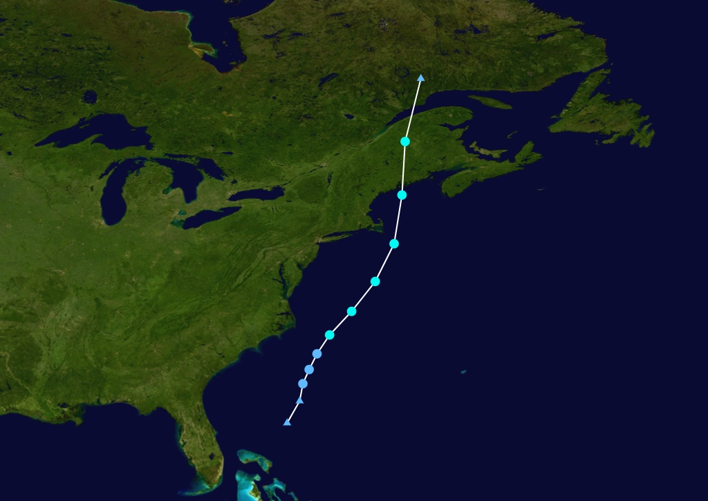 On September 5, a tropical wave exited the west coast of Africa. The wave tracked westward and west northwestward over the next several days with little to no development as wind shear and dry air prevented significant organization. The wave passed north of the Greater Antilles on September 11, where the National Hurricane Center began monitoring it for potential development. After curving northward and passing over the Bahamas, the low began showing signs of organization, and on September 13, it was upgraded into a tropical depression. The depression slowly intensified later that same day and reached tropical storm intensity, receiving the name Imelda. Imelda began to accelerate northeastward, almost parallel to the United States east coast, ahead of an approaching frontal boundary. Warm waters associated with the Gulf Stream allowed Imelda to intensify as it moved further north, and it attained a peak intensity with winds of 50 mph and a barometric pressure of 995 millibars. Imelda continued to rapidly accelerate, and it turned northward toward the upper New England coast on September 14. Baroclinic forcing allowed Imelda to retain its intensity despite sea surface temperatures beneath the storm plummeting as it moved further north. Late on September 14, Imelda made landfall in Maine at peak intensity as it raced northward. Following landfall, Imelda quickly entered extratropical transition and later fully transitioned into an extratropical cyclone over Labrador on September 15. The extratropical remnant was absorbed a few hours later by another extratropical cyclone over eastern Canada.