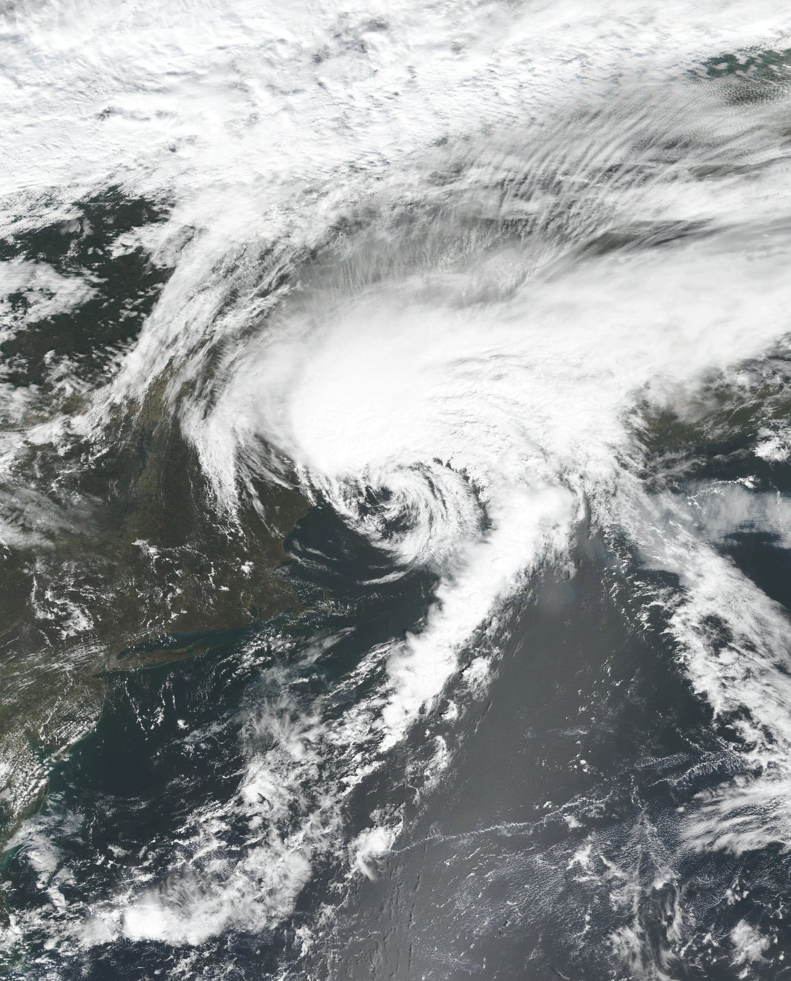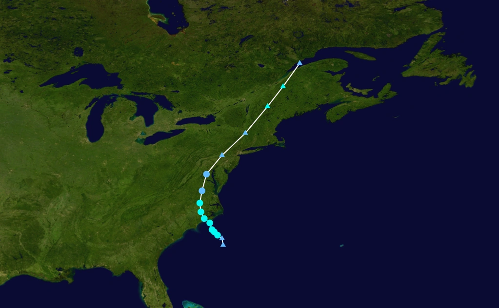 On September 23, a trough of low pressure formed over the southwestern Atlantic Ocean, midway between the Bahamas and Bermuda. The trough split, forming two separate areas of low pressure over the following few days, with the western low later developing into Olga. The eastern low began showing signs of organization on September 25, and the following day, it had organized enough to be classified as Tropical Storm Nestor. Nestor moved generally northwestward and intensified as it approached North Carolina, reaching its peak intensity with winds of 50 mph and a barometric pressure of 993 millibars on September 27. At the time, Nestor began to appear like a subtropical storm, but maintained enough deep convection to remain a tropical storm. Nestor then made landfall in North Carolina at peak intensity later on the 27th. The storm curved northward and began to accelerate as it crossed the eastern United States ahead of a frontal boundary. Nestor degenerated into a post-tropical cyclone on September 28 over the state of Maryland after losing much of its associated deep convection. The remnant curved northeastward, passing over New England and Labrador before dissipating a few days later.