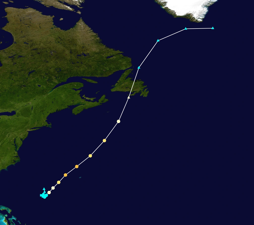 On September 23, a trough of low pressure formed over the southwestern Atlantic Ocean, midway between the Bahamas and Bermuda. The trough split, forming two separate areas of low pressure over the following few days, with the eastern low quickly organizing into Nestor. The western low meandered westward and southward over the next two days, with very limited convection developing due to its proximity to Nestor. After Nestor moved further away on September 27, the low began to show signs of organization. Organization increased enough for the low to be classified as Subtropical Storm Olga on September 28. Olga moved southward and turned eastward on September 29, meanwhile, it began transitioning into a tropical storm as it passed over warmer sea surface temperatures. Later on September 29, Olga transitioned into a tropical storm and began to quickly intensify. Mid-latitude westerly flow began to influence Olga as it continued intensifying, and the storm started moving northeastward on September 29. Olga attained hurricane status late on the 29th as an eye rapidly developed. Rapid intensification ensued on September 30, and Olga reached major hurricane status and its peak intensity with winds of 115 mph and a barometric pressure of 955 millibars later that day. During this time, Olga was quickly accelerating northeastward, passing west and north of Bermuda as a major hurricane. Wind shear increased drastically on October 1, inducing weakening despite the hurricane passing over the warmer waters of the Gulf Stream. Olga began to undergo extratropical transition on October 1 as it passed north of the Gulf Stream and over much cooler sea surface temperatures. Late on the 1st, Olga transitioned into an extratropical cyclone, just a few hours before making landfall in Newfoundland with sustained wind speeds of about 85 mph. Olga's extratropical remnant weakened quickly as it passed over Newfoundland and emerged into the Labrador Sea on October 2. The remnant turned eastward, passing just south of Greenland on October 2 before merging with another extratropical system over the north Atlantic.