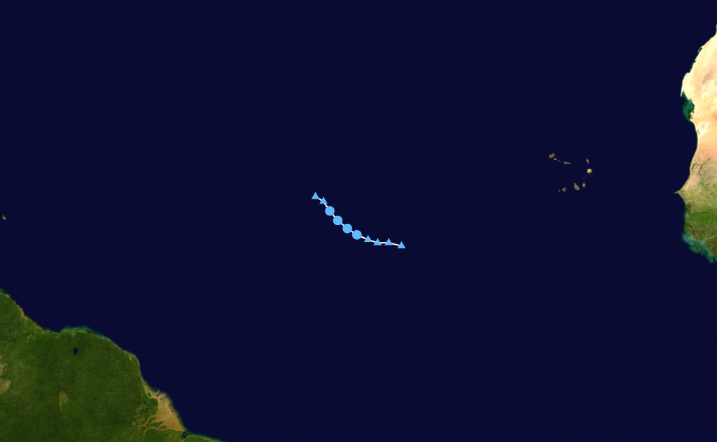 On September 28, a tropical wave exited the west coast of Africa. The wave tracked steadily westward over the next four days with little development. On October 2, organization began to improve, and advisories were initiated on Tropical Depression Eighteen on October 4. Eighteen was not forecast to intensify any more due to being located in an unfavorable environment consisting of strong wind shear. The depression moved steadily west northwestward and failed to intensify further due to the shear. On October 5, convection became increasingly limited, and it later degenerated into a remnant low. The remnant persisted for several more hours before losing its defined low-level circulation and opening up into a trough.