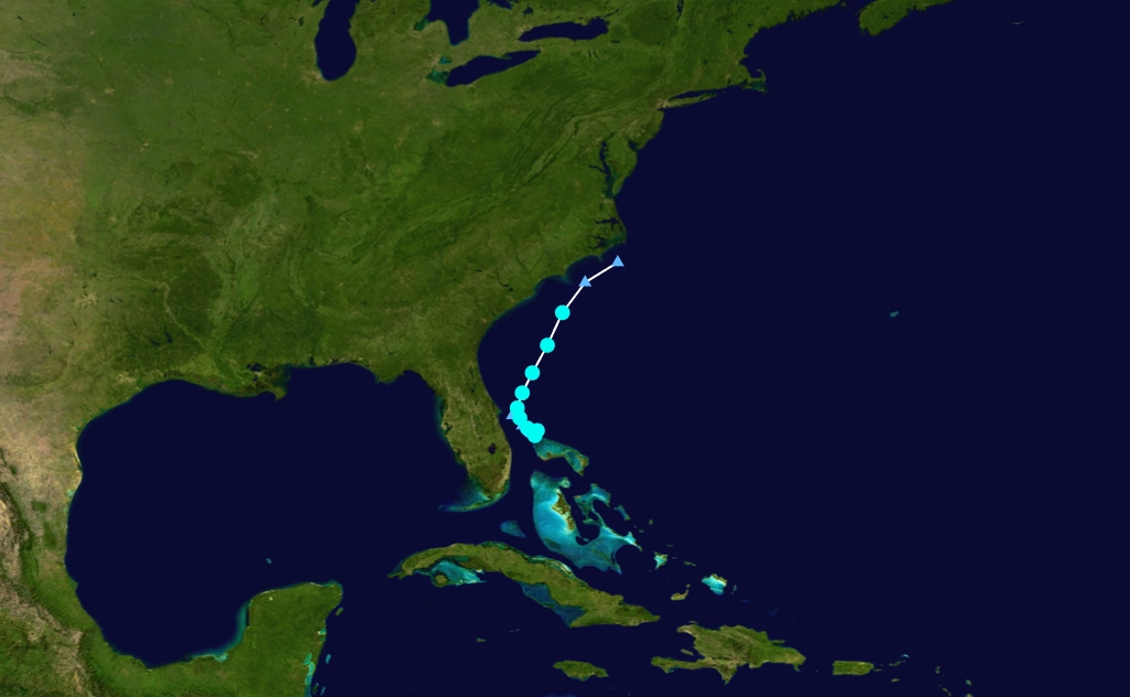 On September 20, a small mesovortex low developed along the east coast of Florida. The low began to develop deep convection as it moved southeastward, and the following day, it was upgraded into a tropical depression. The depression quickly intensified into Tropical Storm Lorenzo just six hours later as it neared Grand Bahama and Great Abaco. Lorenzo turned southwest and eventually northwest as a nearby trough of low pressure formed to its east. This trough pushed Lorenzo northwest through September 22, before the storm eventually turned northeastward ahead of a frontal system. Lorenzo attained its peak intensity as a weak tropical storm with winds of 45 mph and a barometric pressure of 1007 millibars on September 23, before increasing wind shear generated by the frontal system began afflicting it. Lorenzo continued to weaken slowly as it moved northeastward, before ultimately degenerating into a remnant low on September 24 offshore of North Carolina. The remnant low turned eastward before being absorbed into the frontal system the following day.