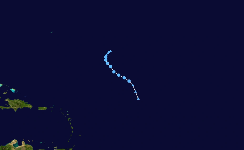 On June 21, a tropical wave exited the west coast of Africa. The wave tracked westward during the following week with little to no development. As it approached the Lesser Antilles, the National Hurricane Center (NHC) began to monitor it for potential tropical development during the next seven days. Early on June 29, the NHC began issuing advisories on Potential Tropical Cyclone Two as it neared the Leeward Islands. Two began to curve northwestward as it crossed over the Leeward Islands and entered the northeastern Caribbean Sea later on June 29. That same night, it was upgraded into a tropical depression after flight reconnaissance discovered a closed low-level center amid deep convection. Two began to move briskly northwestward and intensified into a tropical storm on June 30, earning it the name Barry. Tropical Storm Barry made landfall in Puerto Rico shortly afterward as it continued on its quick northwest heading. After crossing Puerto Rico, Barry began to encounter increasing wind shear which displaced a lot of its deep convection away from its low-level center of circulation. Barry weakened into a tropical depression on July 1 as it passed north of Hispaniola and began to decelerate. The depression continued to suffer the effects of strong wind shear as it passed just north of the Turks and Caicos Islands early on July 2. Despite continued strong wind shear, Barry was able to re-intensify into a tropical storm later on July 2 after re-developing a new low-level center of circulation. Wind shear began to relax slightly as Barry curved northward on July 2, allowing for more intensification. As Barry moved away from the Lucayan Archipelago, it began to develop a well-defined core and an eye-like feature. Barry began to accelerate and curved northeastward ahead of an approaching front on July 3, all the while continuing to steadily intensify. On July 4, an eye became evident on satellite imagery, and Barry was upgraded into the first hurricane of the season. Continued intensification occurred, and Barry attained its peak intensity with winds of 85 mph and a barometric pressure of 975 millibars late on July 4. Barry rapidly accelerated northeastward as the frontal boundary to its northwest approached, taking it over progressively cooler waters. This induced extratropical transition on July 5 as Barry passed south of Nova Scotia. Later that same day, Barry fully transitioned into an extratropical cyclone while situated several hundred miles south of Newfoundland. The extratropical cyclone continued to slowly weaken as it slowly passed south of Newfoundland during the next two days. On July 8, the remnant cyclone accelerated northeastward across the north Atlantic before dissipating several hours later.