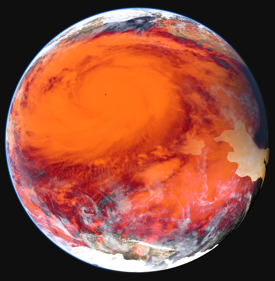 At 23:00 UTC, Ethan's barometric pressure had fallen to 1 mbar. Six minutes before the clock struck midnight, the clouds around Ethan's eye were starting to be pulled and collapsing inward. Although it seemed Ethan might've started weakening, that was not the case. Just as the clock struck midnight, the clouds briefly parted as the instruments recorded a peak intensity of 1330 mph, 0 mbar, and Ethan revealed what was at its core: a black hole just a few miles wide, around the size of its eye, pulling in everything around it. The ground and clouds were stretched towards Ethan's eye. By 02:00 UTC, cloud cover associated with the storm had stopped spinning completely, making Ethan no longer look as though it was a hurricane. The black hole hovered only a few miles above the surface, where Ethan's eye would have been. At 03:32 UTC, it was reported that large chunks of the planet began breaking off and flew right toward the vacuum at Ethan's core, and Ethan began absorbing the planet. The last known communication with Youricane was intercepted on January 16 (due to delays between the remains of Youricane and systems on Earth), saying, "It has been an honor being here on Youricane. *static* G *static* dbyy-" before the signal was lost.[2]