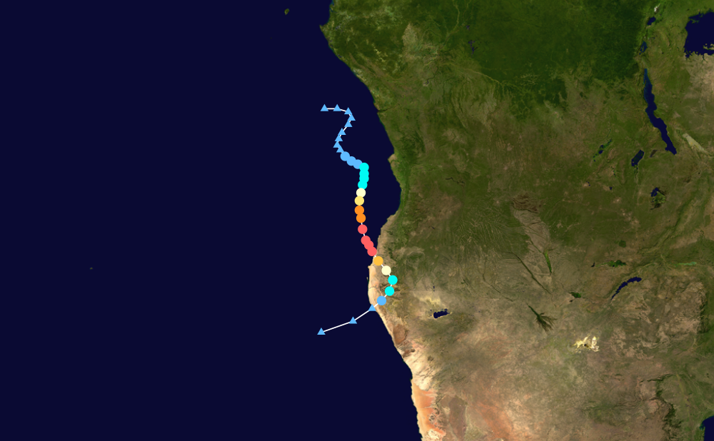 Rapid weakening began as Simba moved inland over Namibian soil. The storm completed its extratropical transition shortly upon returning over water on June 12. Increased wind shear and cooler water temperatures led to Simba's complete dissipation by June 13.