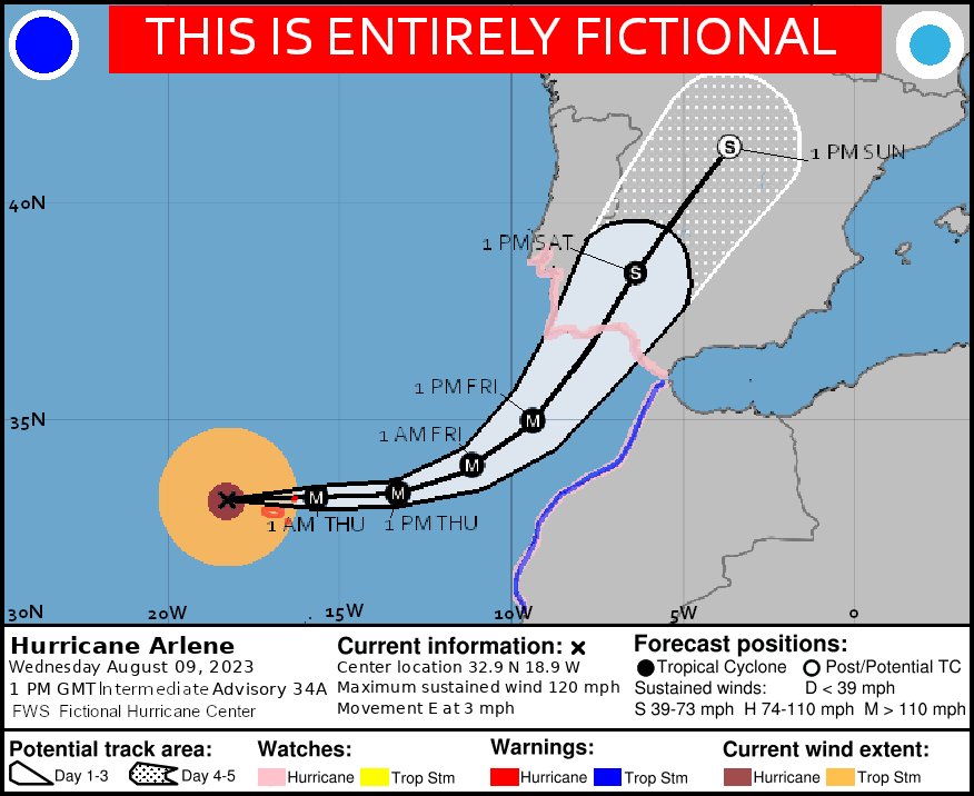 Advisory on Arlene at 12:00 UTC August 9th, 9 hours before landfall in Porto Santo.