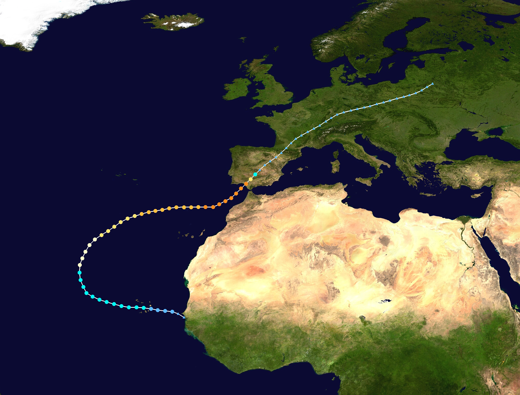 Arlene's precursor formed on August 1, just off the western coast of Africa. In favorable conditions, it developed into a tropical depression on the same day as it moved west. On August 2, it intensified into a tropical storm and was named, from which point it continued to intensify. In unusually warm waters, Arlene intensified into a hurricane on August 5 as it started its northeasterly trek. Intensification continued as Arlene approached Europe, and it became the first major hurricane of the season on August 8. Intensification halted for a little while Arlene approached the Madeira archipelago and made landfall on Porto Santo island on August 9, however as Arlene hit record breaking sea surface temperatures and extremely favorable conditions, on August 10, it was upgraded and became the easternmost category 4 hurricane in the Atlantic. On August 12, Arlene made its worst landfall, in the Doñana National Park in Spain, as a category 4 hurricane at its peak intensity, becoming the most intense storm to do so. After landfall, Arlene rapidly degenerated, becoming a remnant low on August 13. Its remnant low continued on its northeasterly course, moving across a large part of Europe producing major rainfall, until finally dissipating on August 20, near the Lithuanian - Belarusian border.