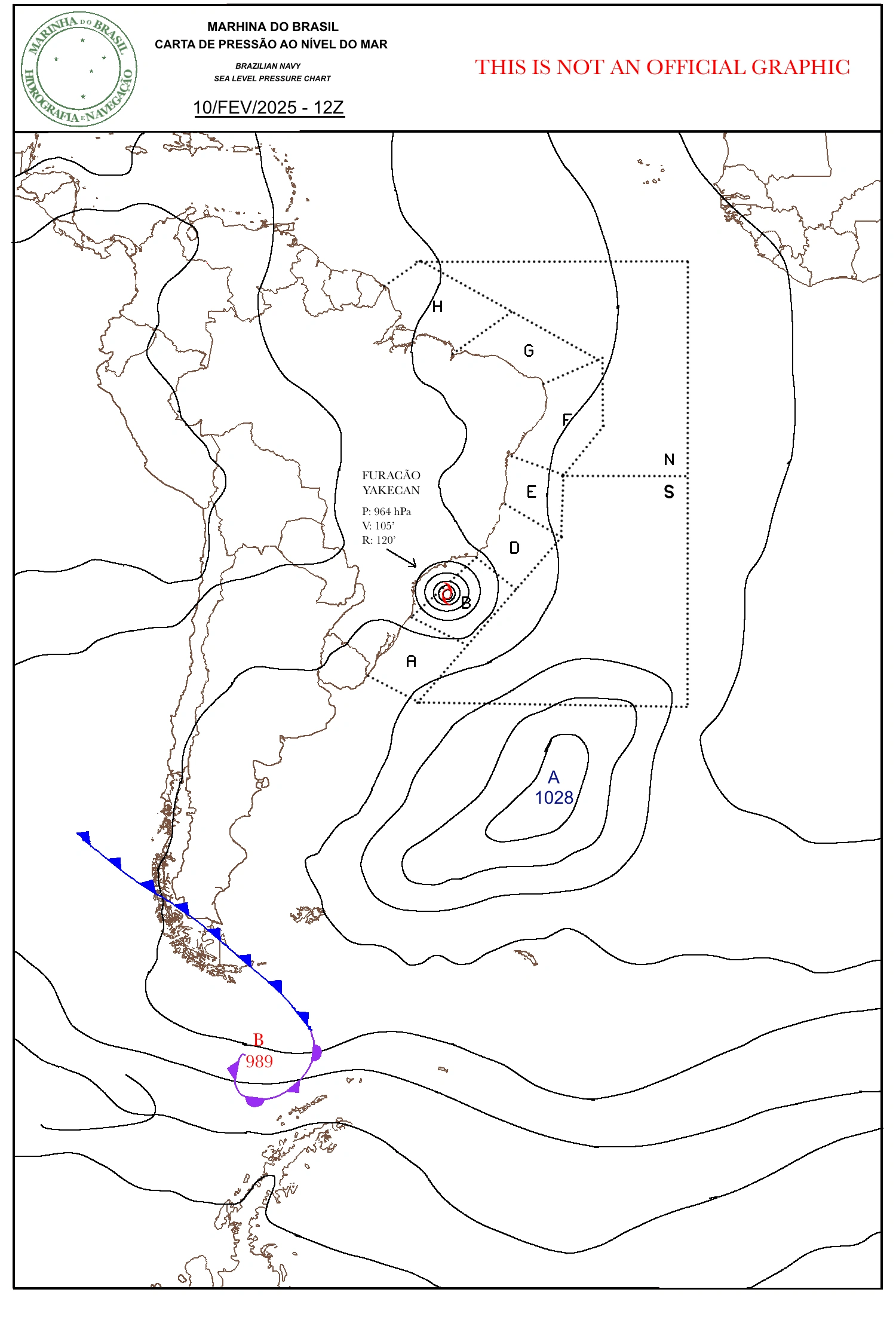 A sea level pressure chart made by the Brazilian navy, during Yakecan's peak intensity