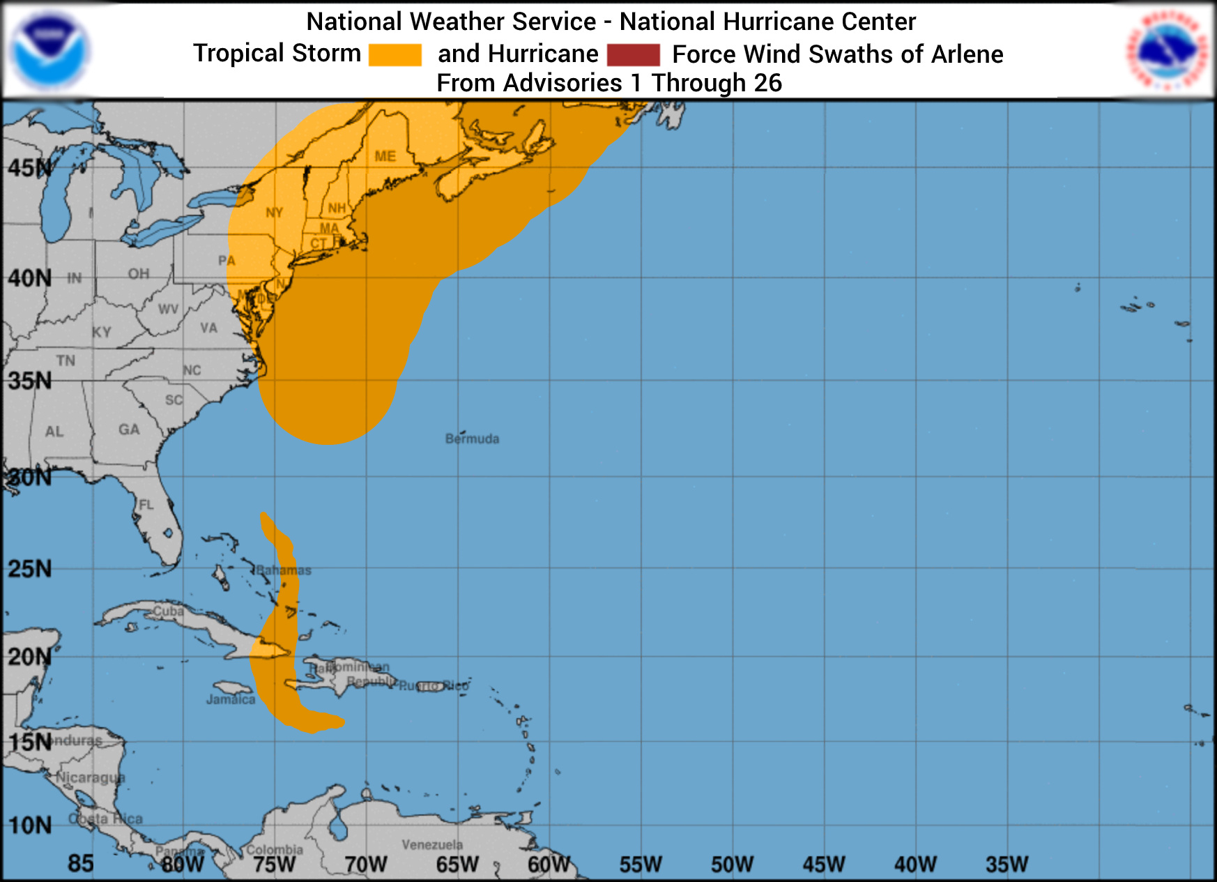 Tropical Storm Arlene issued Tropical Storm Warnings from New Jersey to Maine, and even a Hurricane Watch in parts of New York, Connecticut, Rhode Island, and Massachusetts being the earliest Hurricane Alert on record, as well as the first Hurricane Watch in the area since Hurricane Irene.