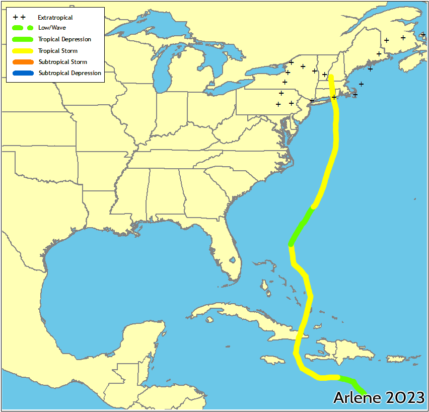 On the same day, Arlene turned Ex-Tropical over the state, demolishing the state with over 97% of Long Island losing power for multiple days.